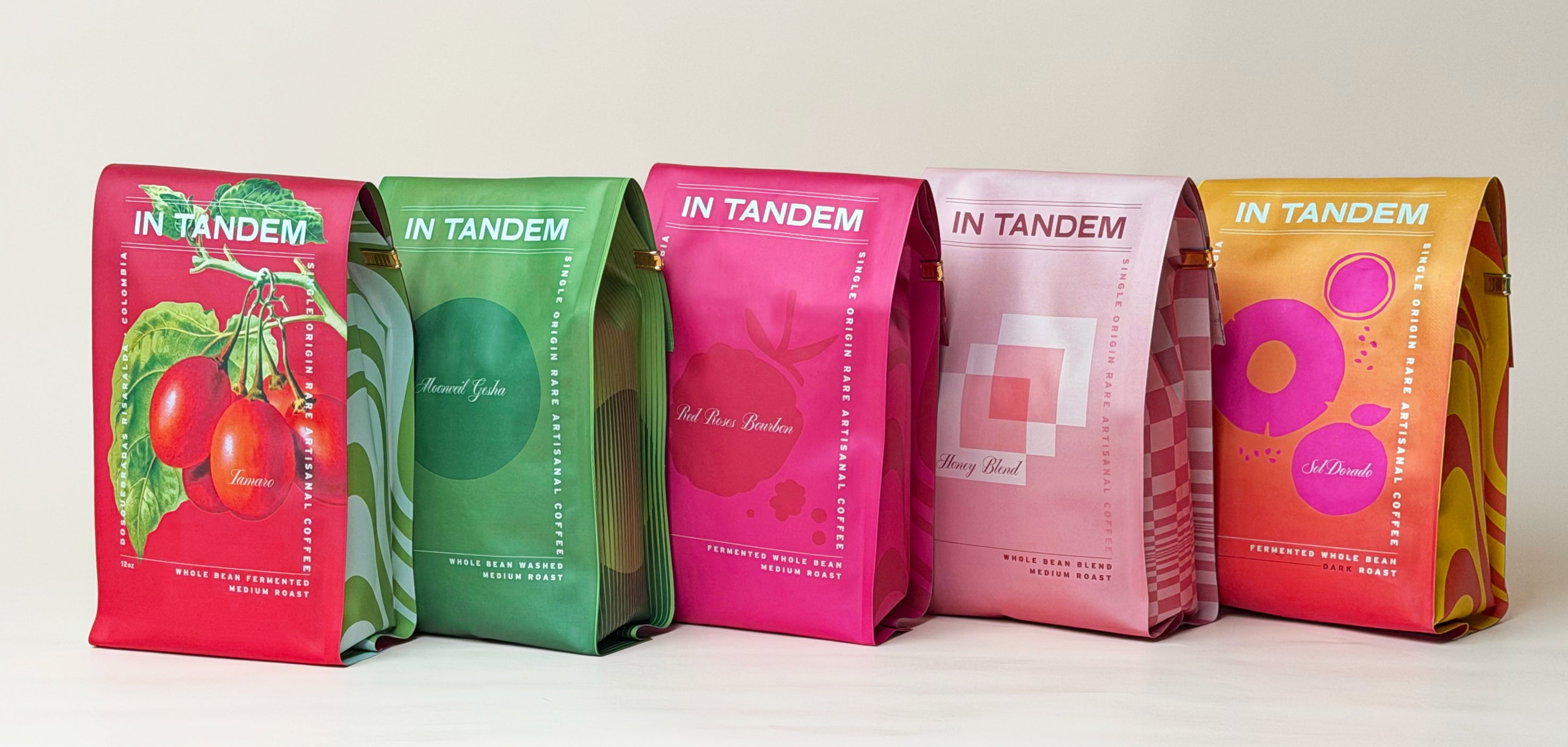 Meet the In Tandem Tasting Set, one bag of each of our signature coffees, curated for pure discovery and pleasure. From the ethereal lemongrass flavors of Moonveil Gesha, to the lush sweetness of Red Roses Bourbon, the grounded elegance of Tamaro, the sun-kissed warmth of Sol Dorado, and the silky, comforting balance of our Honey Blend, this set lets you experience the full spectrum of what we do best.